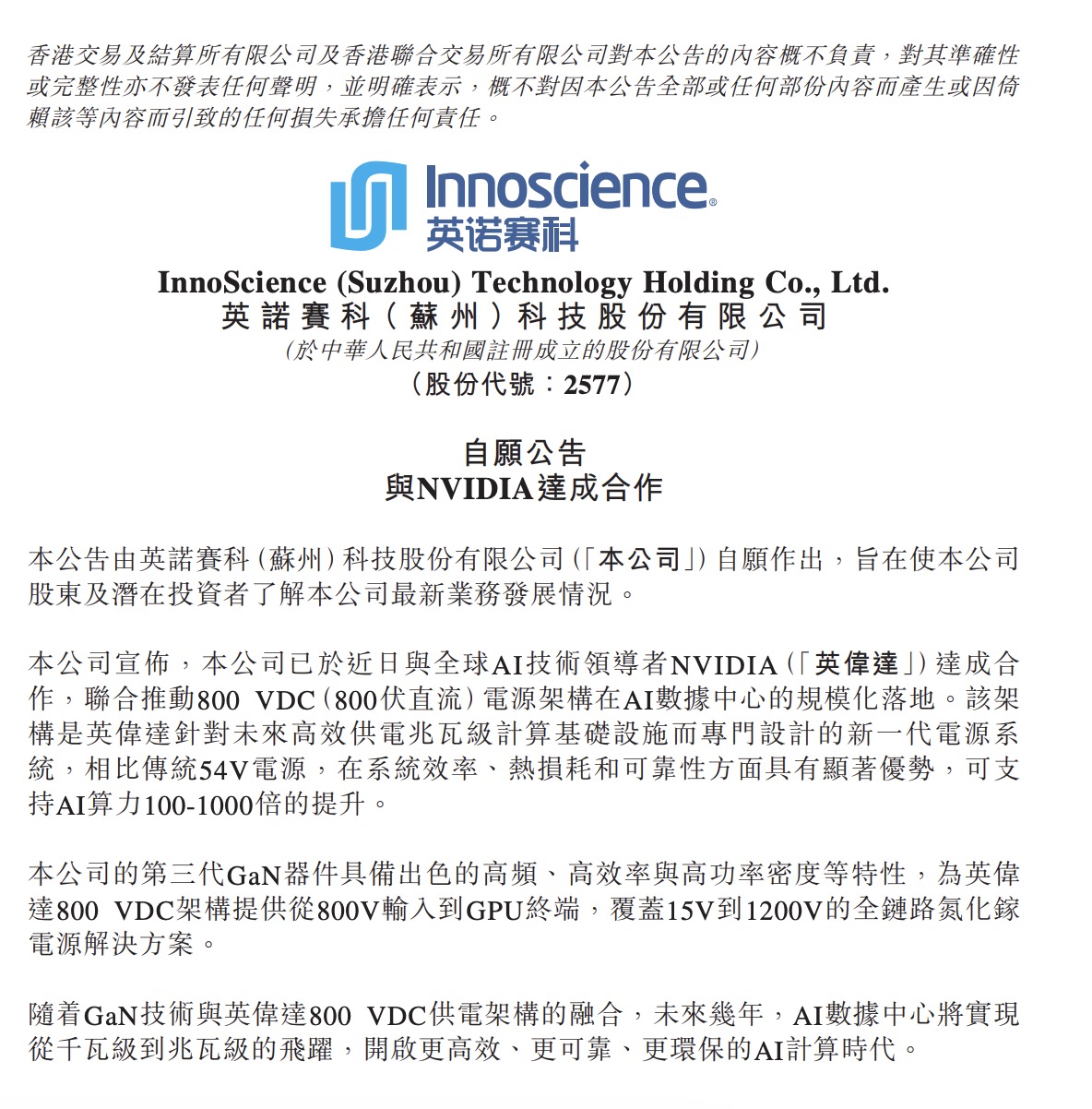 最近梳理了下内容,英伟达技术博客早在25年5月20号就披露英诺赛科测试,英诺赛科在8月1号披露达成合作,估计是已经通过测试才披露的信息,可能不存在什么测试阶段,后面大概率会披露订单合同。
