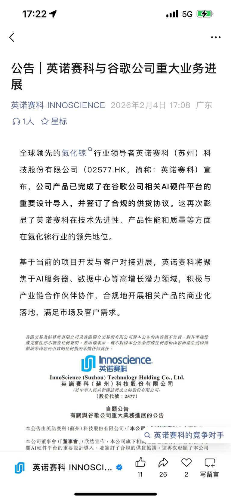 $英诺赛科(HK|02577)$ 公众号才开始发新闻