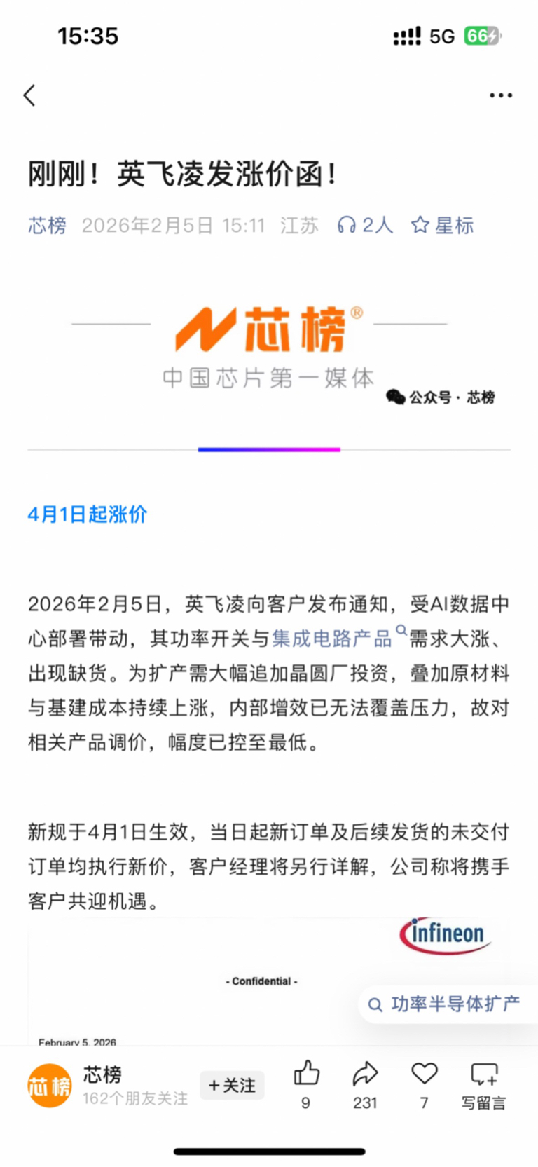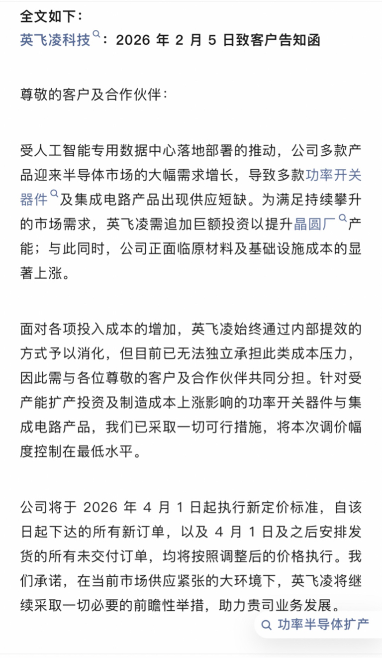英飞凌刚刚发涨价函了,ai数据中心需求带动,功率半导体供给紧张,英诺赛科产能充足