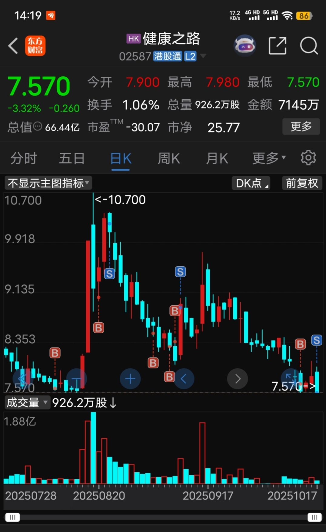 $健康之路(HK|02587)$ 手机吧嗒一声,我看看发生了甚么事,原来是把我止损单打出来了。这个票不讲武德,劝你耗子尾汁。不出意外,大势不复返矣。