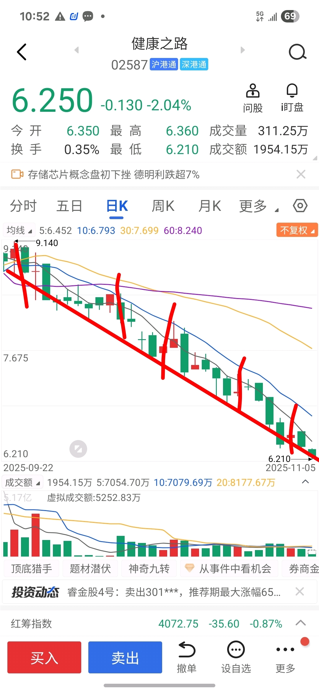 $健康之路(HK|02587)$ 一红三四天绿,自己看下还要跌多久