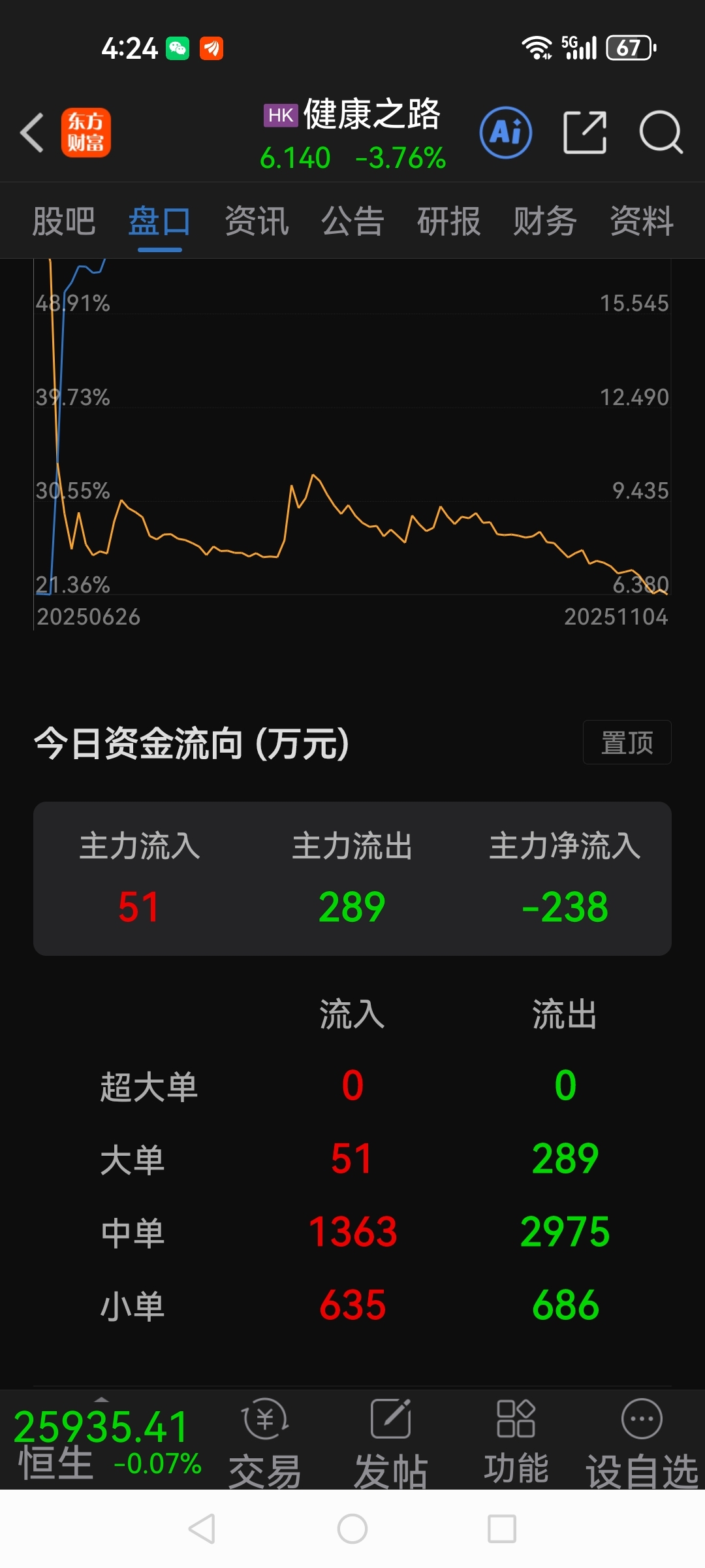 $健康之路(HK|02587)$ 资金持续流出,庄家继续洗盘。难道还要到5.00元不成?今天下午收盘来了一次巨跌测试,这是要测试一下预期的底部,看看多少人跟风进来。可惜又拉起来了,说明一旦跌到5.70元左右,抄底大军蜂拥而至,庄家很恐惧,所以只能拉起来收盘6.14元。