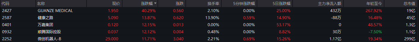 医疗设备与服务板块走强,GUANZE MEDICAL涨超40%,健康之路涨近14%,万嘉集团涨超12%。