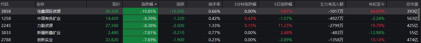 有色金属板块走弱,佳鑫国际资源跌超10%,中国有色矿业、力勤资源跌超8%。