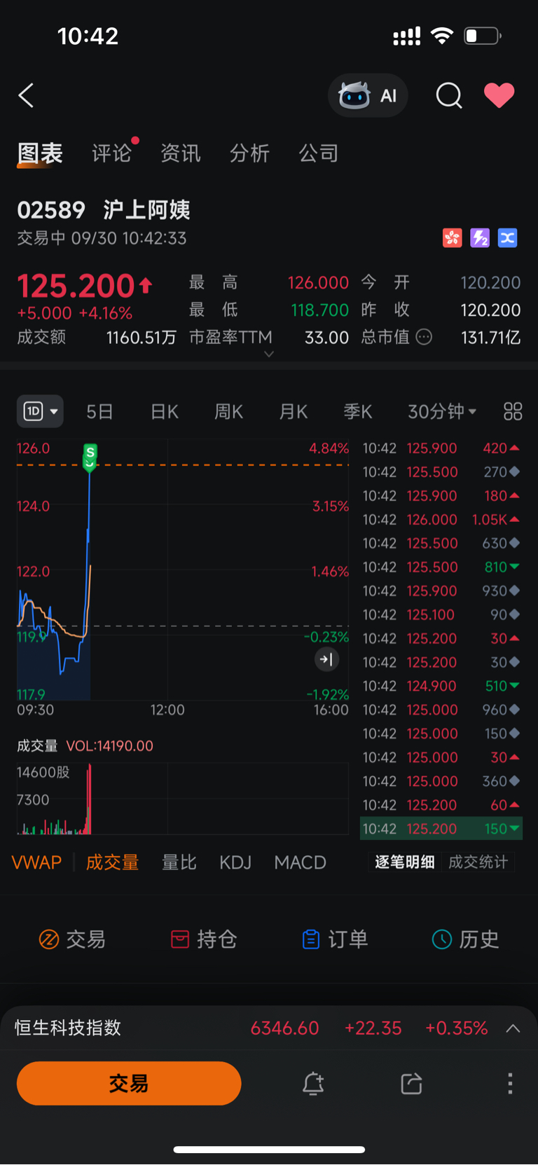 $沪上阿姨(HK|02589)$ wen神不走,涨不起来,昨天抄某垃的低,今天赚5个点落袋为安过长假期