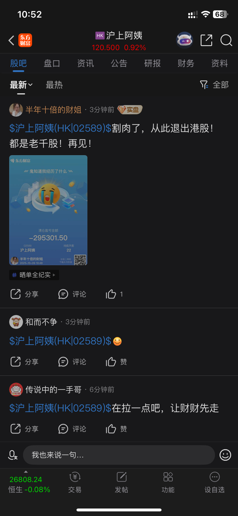 温馨提示: 1.根据《证券法》规定,禁止编造、传播虚假信息或者误导性信息,扰乱证券市场;2.用户在本社区发表的所有资料、言论等仅代表个人观点,与本网站立场无关,不对您构成任何投资建议。用户应基于自己的独立判断,自行决定证券投资并承担相应风险。《东方财富社区管理规定》