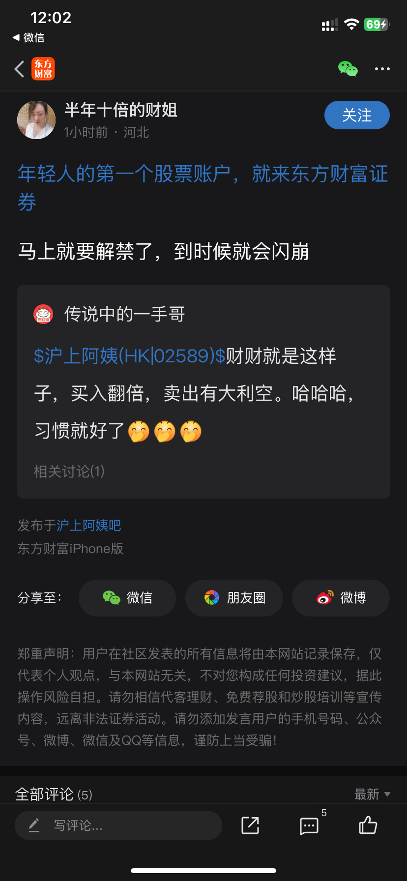 郑重声明:用户在财富号/股吧/博客等社区发表的所有信息(包括但不限于文字、视频、音频、数据及图表)仅代表个人观点,与本网站立场无关,不对您构成任何投资建议,据此操作风险自担。请勿相信代客理财、免费荐股和炒股培训等宣传内容,远离非法证券活动。请勿添加发言用户的手机号码、公众号、微博、微信及QQ等信息,谨防上当受骗!