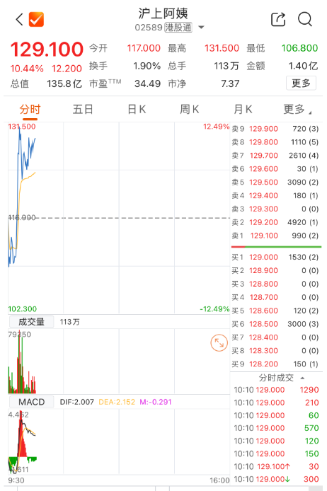 上证报中国证券网讯截至11月13日10时10分,港股沪上阿姨涨超10%。该股昨日收涨28.96%。