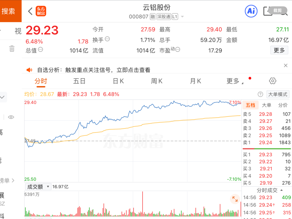 云铝股份大涨6.5% 29.23收盘PE 17.3倍,中国铝业比价上17元。中国铝业H股买入1674万股一卖1012万股=今天大买入建仓662万股,第一天建仓后市15-17元