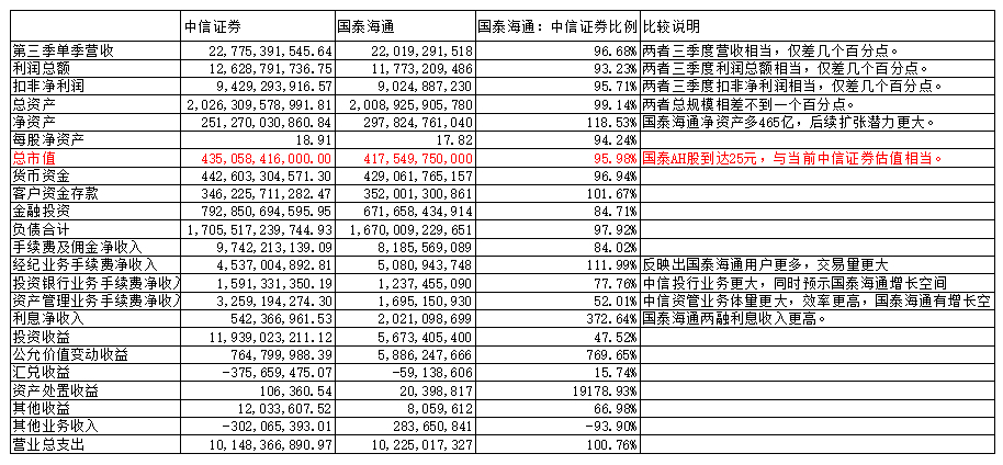 两家头部券商第三季度营业收入和利润,总资产和净资产规模基本相当,具有很明显的比价效应。对比中信证券,国泰海通合理估值应该是25。详见下表:
