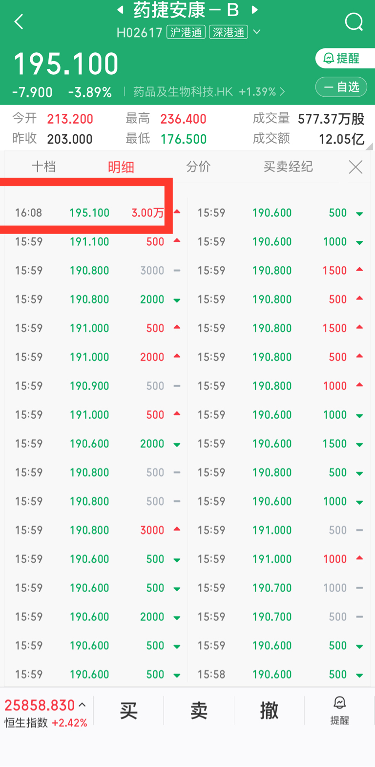 $药捷安康-B(HK|02617)$ 195.10成交3万股合计买入约5853万