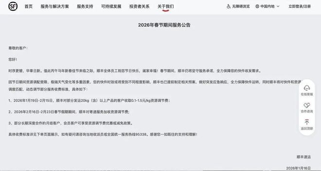 顺丰速运、德邦快递客服均回复春节期间不停运,但运输费用会有调整。顺丰小程序上一条公告显示,顺丰会在2月16日至2月23日春节假期期间,对寄递服务加收资源调节费。有媒体从顺丰快递员处了解到,部分区域春节期间会加价10元。