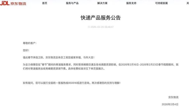 京东物流回应称,根据春节期间快递流量情况,部分站点可能会出现排班情况,且会产生资源调度费,具体需以站点为准。据京东物流发布的《快运产品服务公告》显示,受高峰期交通及各地调度资源影响,在2026年1月19日—2026年2月23日期间,将在特快重货产品原价格基础上加收0.1—1.2元/kg的高峰期资源调节费。对部分合作月结的客户,将按照相应的合作产品,分别在不同时间周期加收不同标准的资源调节费。