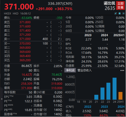 不过,从各方面而言,诺比侃本次上市均只能算是一个小型IPO,即使在大涨363.75%之后,其总市值也不过140亿港元。诺比侃本次募资仅约3亿港元,所得款净额约为2.57亿港元。