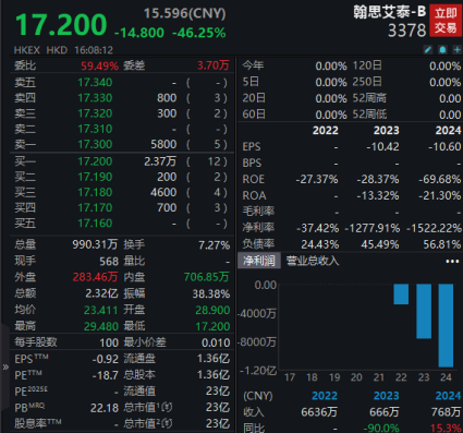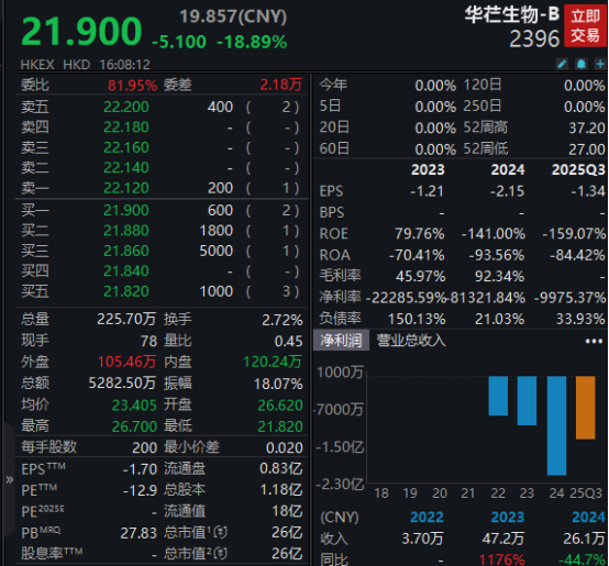 在本次上市的3家公司中,作为生物科技的公司翰思艾泰可谓表现最差,上市首日股价就接近腰斩。而昨日上市的同类型公司华芢生物同样遭遇“滑铁卢”,上市首日股价大跌29.32%。今日,华芢生物股价再度大跌18.89%。