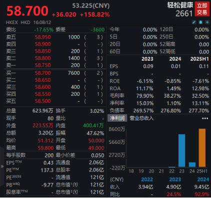 与诺比侃一同大涨的还有轻松健康。招股书显示,该公司在中国提供健康相关及保险相关解决方案。根据沙利文报告的资料,按2024年的收入计,公司在中国数字综合健康服务及健康保险服务市场排名第10位。按2024年的收入计,公司在中国数字健康服务市场排名第七。