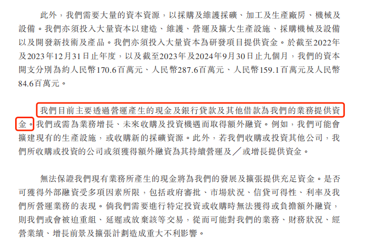 从过往数据来看,截至2022年及2023年12月31日止的年度,以及截至2023年及2024 年的前9个月,公司资本开支不菲,分别约达1.7亿元、2.9亿元、1.6亿元及8460万元。利润不够资本开支,需要借款维持运营,资金压力大。