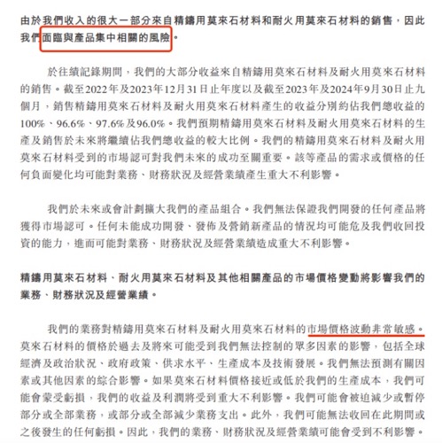 再看产品结构,金岩高新面临产品集中风险,精铸和耐火用莫来石材料的销售长时间占据营收大头。从具体数据来看,2022-2023年全年以及2023-2024年的前9个月,这两类产品的销售收益在总收益中的占比极高,分别约为100%、96.6%、97.6%和96%,预计未来在总收益中的占比仍将居高不下。