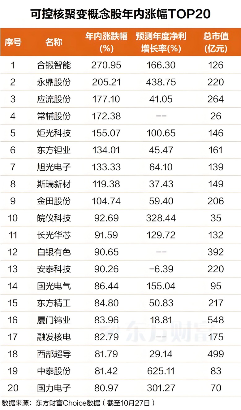 东方财富Choice数据显示,可控核聚变概念股年内多股翻倍,合锻智能、永鼎股份、应流股份、常辅股份、炬光科技、东方钽业、旭光电子、斯瑞新材、金田股份等个股年内至今累计涨幅在271%至100%之间不等。