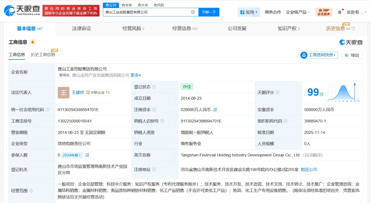 南方财经11月18日电,天眼查工商信息显示,近日,唐山工业控股集团有限公司发生工商变更,新增中国中信金融资产管理股份有限公司为股东,注册资本由85亿人民币增至92.8亿人民币,增幅约9%,同时,部分高管也发生变更。唐山工业控股集团有限公司成立于2014年6月,法定代表人为王建祥,经营范围含企业总部管理、科技中介服务、知识产权服务、企业管理咨询、金属结构销售、金属材料销售、高品质特种钢铁材料销售、化工产品销售等。股东信息显示,该公司由天津唐控科创集团有限公司、唐山控股发展集团股份有限公司及上述新增股东共同持股。