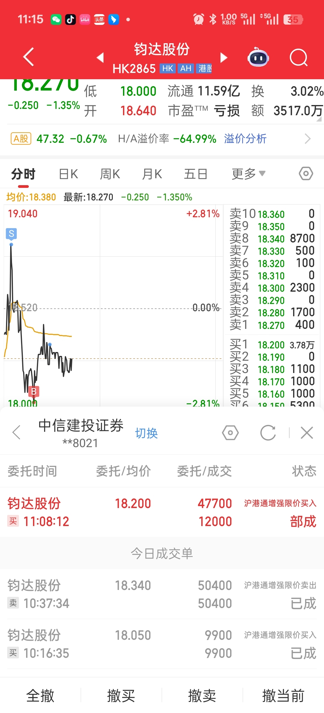 $钧达股份(HK|02865)$ 18.2位置全是我挂的,陆小红你砸呀,接着砸,我看ah溢价能被你干到多少去