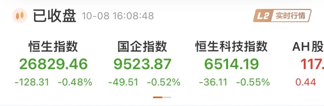 10月8日,港股市场面临调整,三大指数齐跌。截至收盘,恒生指数失守27000点关口,跌0.48%,报26829.46点;恒生科技指数跌0.55%,报6514.19点;恒生国企指数跌0.52%,报9523.87点。“十一”假期期间,恒生指数累计跌0.1%,恒生科技指数累计涨0.75%。