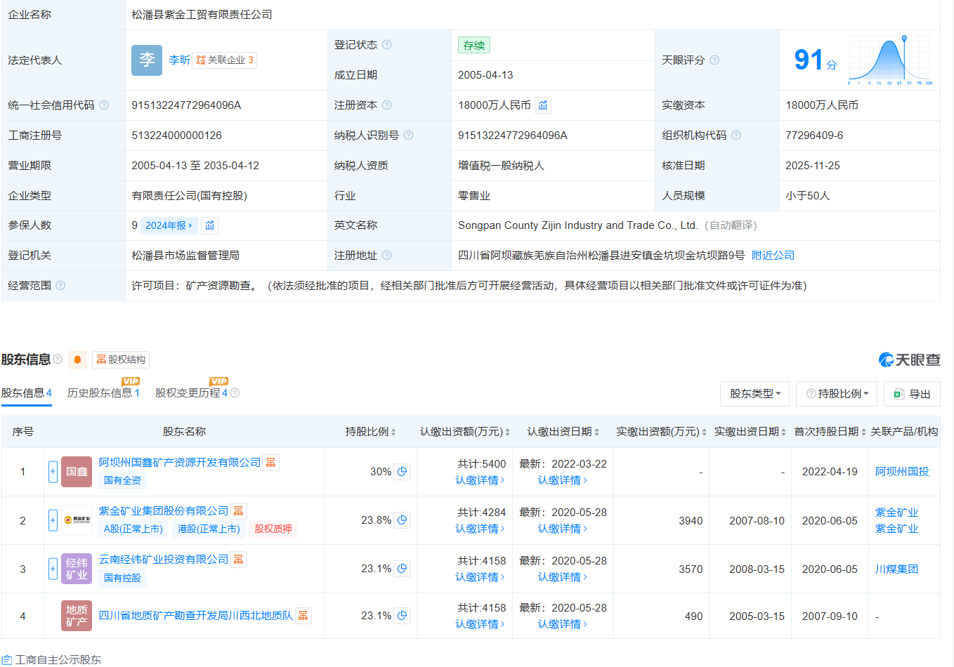 据天眼查,松潘县紫金工贸有限责任公司成立于2005年,注册资本18000万人民币。阿坝州国鑫矿产资源开发有限公司持股30%,紫金矿业集团股份有限公司持股23.8%,云南经纬矿业投资有限公司持股23.1%,四川省地质矿产勘查开发局川西北地质队持股23.1%。