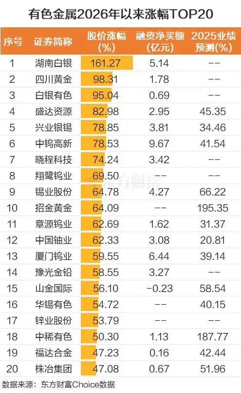拉长时间看,2026年以来,有色金属板块142只个股中有137股上涨,上涨概率约96%,整个板块的上涨中位数为17.01%。湖南白银暂居“涨幅王”位置,上涨了161.27%。四川黄金、白银有色、盛达资源也涨幅靠前。