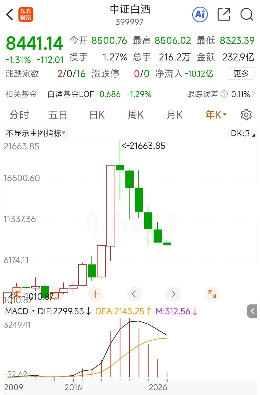 中证白酒指数1月26日盘中最低触及8323.39点,离2024年9月18日盘中的8251.41点阶段低点已近在咫尺。年K线来看,截至2026年1月26日收盘,中证白酒指数已录得6连阴。