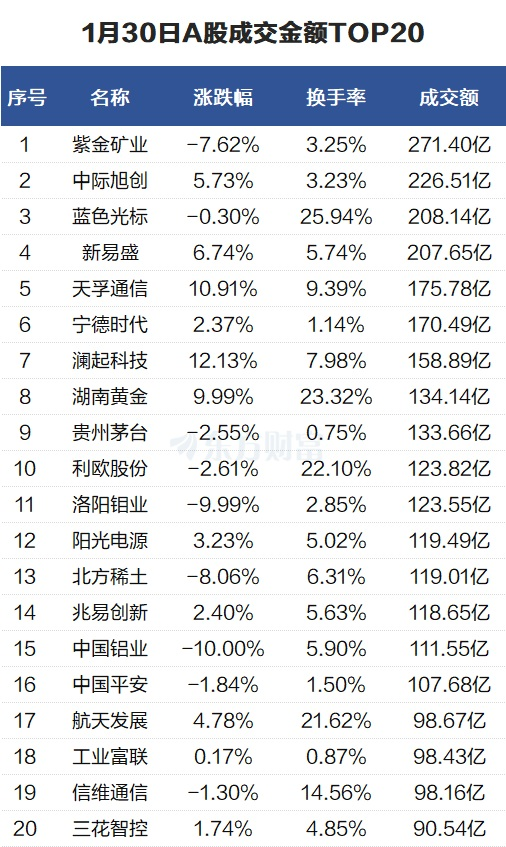 沪深两市成交额2.84万亿元,较上一交易日缩量3945亿元。个股方面,紫金矿业当日成交271.4亿元。中际旭创当日成交226.51亿元。