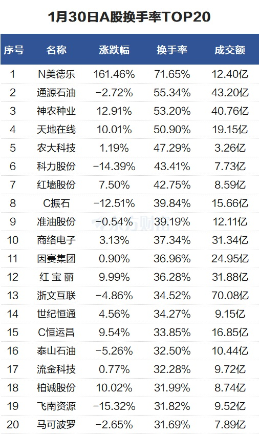 当天换手率最高的个股为N美德乐,全天换手率71.65%。通源石油紧随其后,全天换手率55.34%。