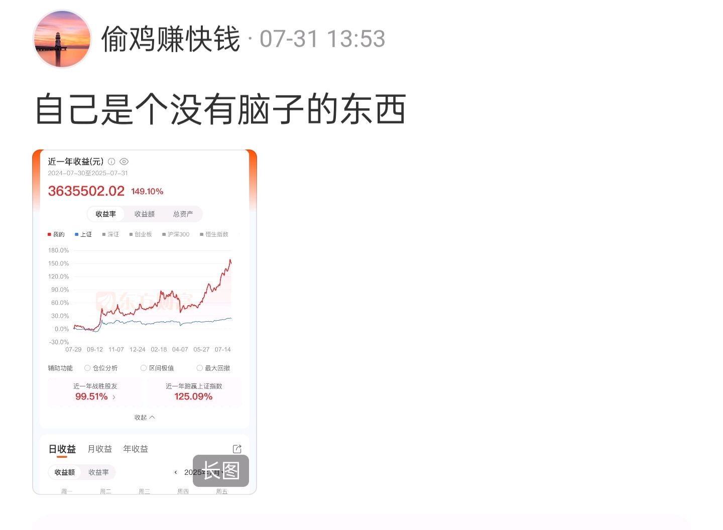 我也懒得跟你说那么多了,反正相信你的人,亏钱也是活该的,毕竟你的受众群体就是那群不会思考的韭菜罢了,你一直在这里卖惨,让很多韭菜以为你一直死拿着。这群韭菜就会想:“这么多钱亏的都这么死拿着,那我也应该死拿着”。我只能说你这种手段挺下三滥,我又没天天盯着你,我回来看一回才发现你还在这儿用这种手段,至于我是胡说八道还是事实,这个你心里也很清楚,所以也没有必要回复我了。反正我7月底就走了,三个月了回来看看而已,不过无论你怎么改名我还是一眼能看出来你这go东西的。