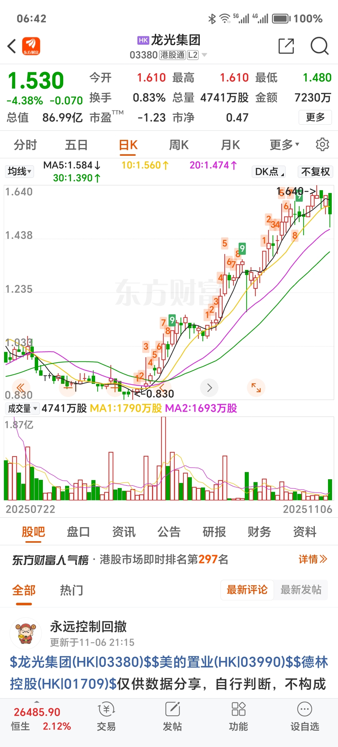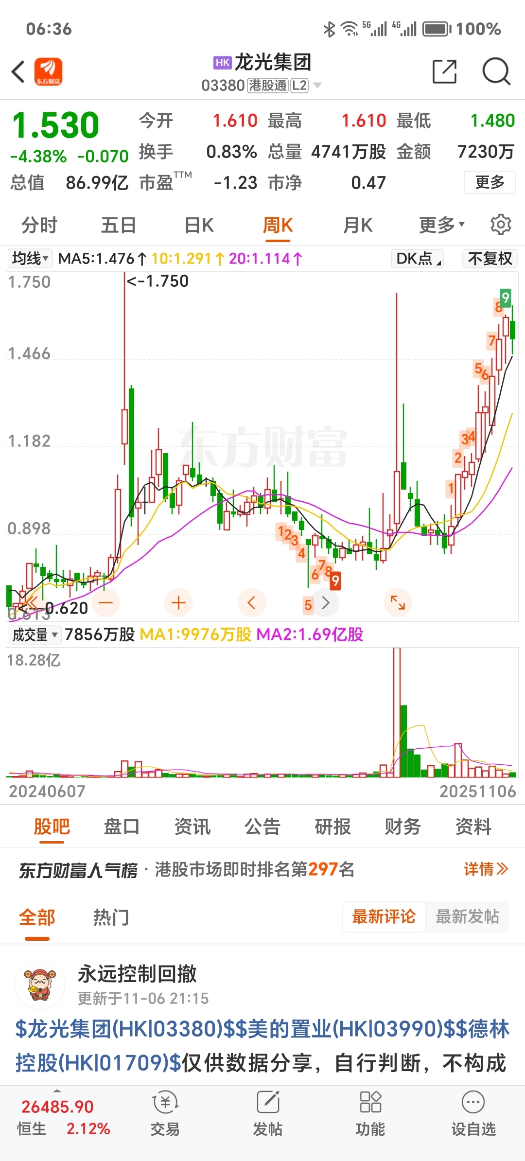 龙光昨天走势有些特别,在进行中期方向性选择。今天走势很关键。