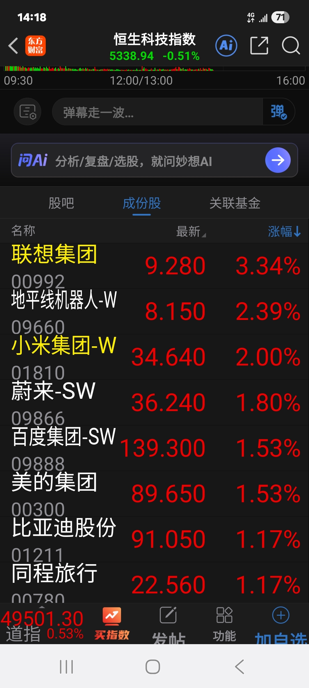 恒生科技成分股涨幅第一是联想集团,母公司联想控股要加油