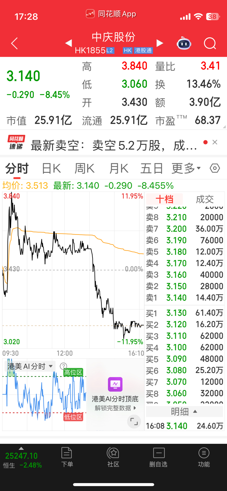 $中裕能源(HK|03633)$ $中庆股份(HK|01855)$ 昨天中庆是大哥,中裕是小弟,今天大哥跌地狱,中裕周一也是高开低走的