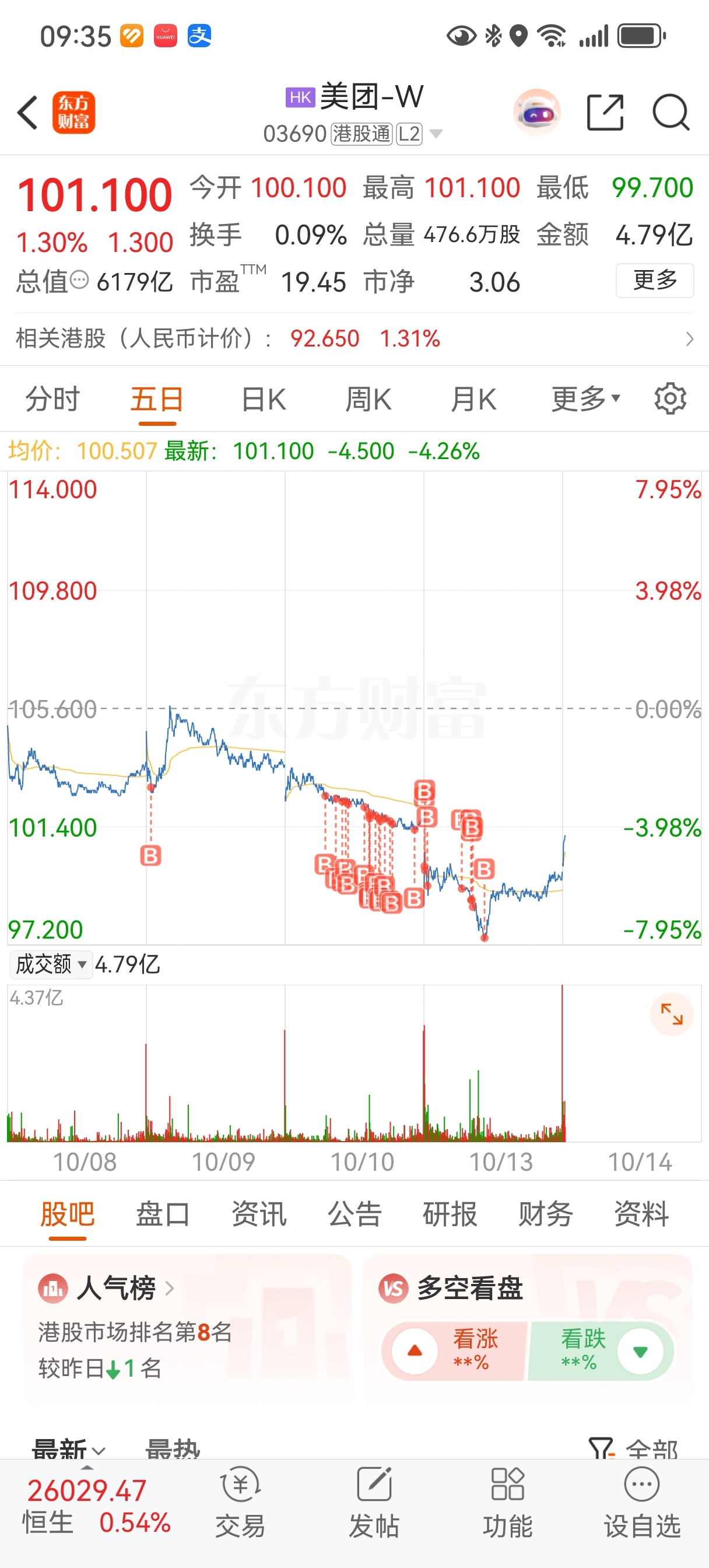 $美团-W(HK|03690)$ 团团加油,突破五日均线!