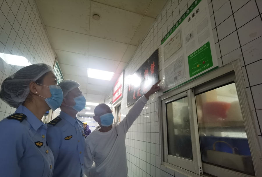 徐汇区市场监管局工作人员查验无堂食餐饮店许可情况,要求“一店一证”。陈玺撼摄