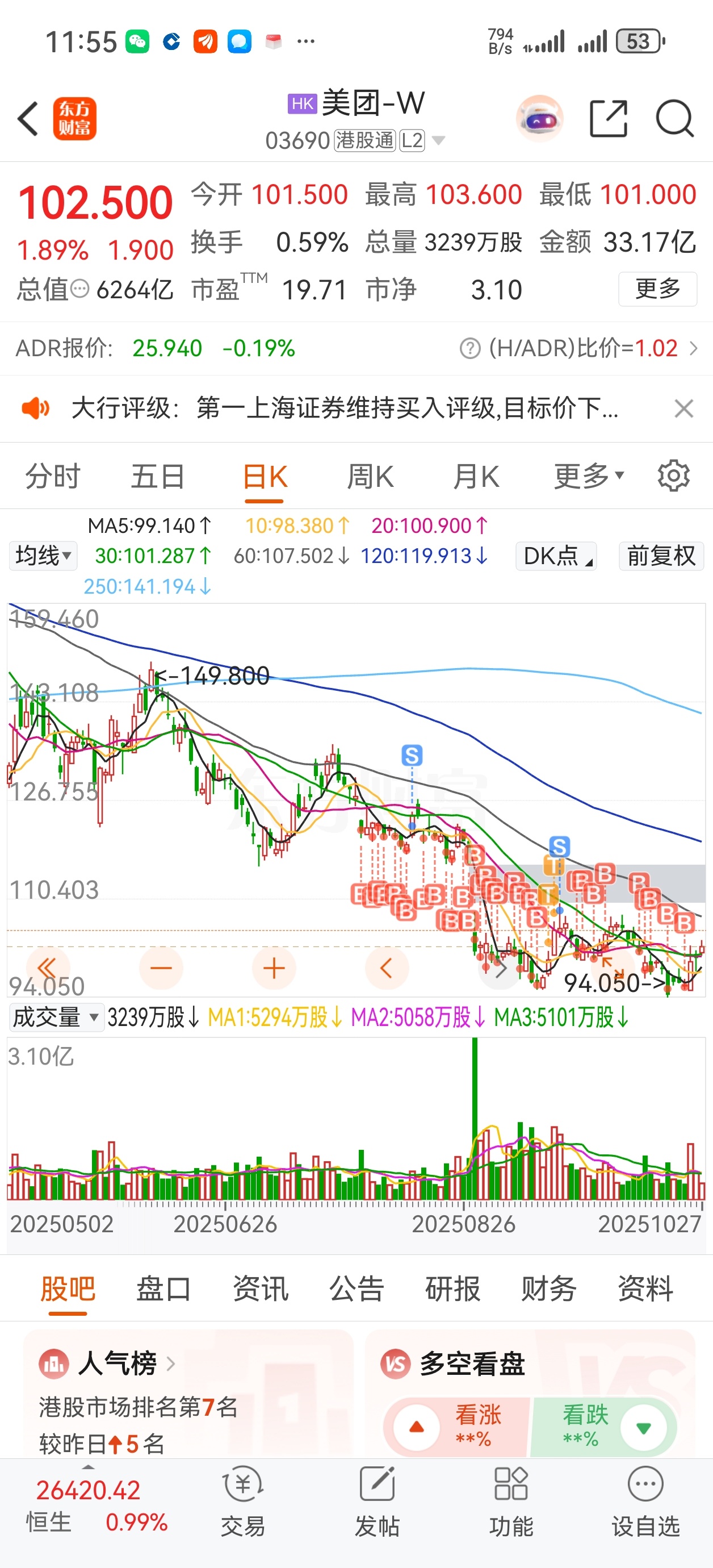 $美团-W(HK|03690)$ 怎么又涨了?仓位还没打完呢,希望再回一次98