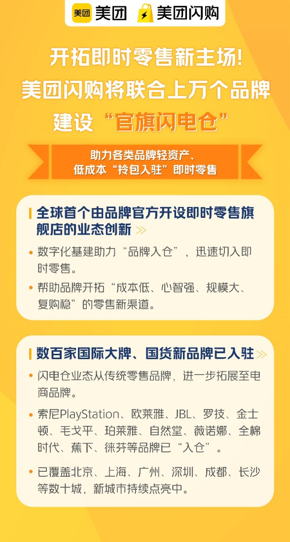 美团闪购方面表示,经过前期试点探索,“品牌官旗闪电仓”未来预计将拓展至上万个品牌,覆盖3C、美妆、运动、服饰、母婴、宠物、百货等各个品类。