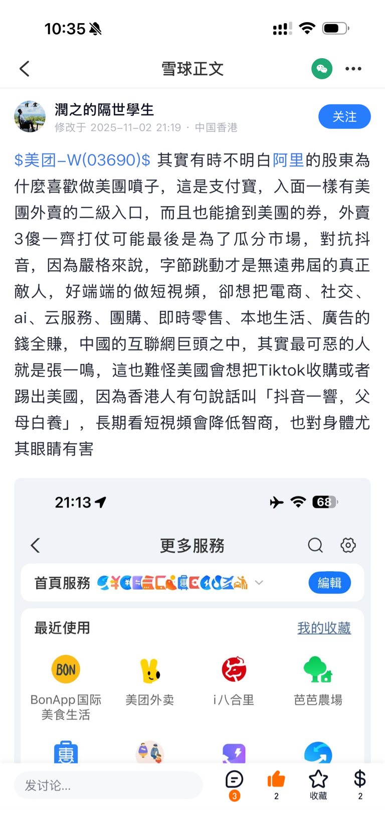 $美团-W(HK|03690)$ 我觉得人家讲得很中肯,阿里被分走的业务在抖音、小红书,拼多多,现在跑来跟美团挤这个市场,搞得两个拿着刀自己捅自己,现在京东也观望了,真不如好好做平台。其他家都等着看好戏呢,然后坐等分肉