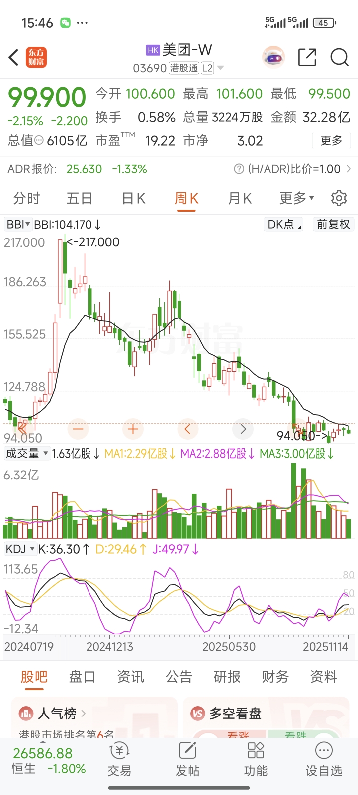 $美团-W(HK|03690)$ 跟之前一样bbi线,挨住就下,60凑双底了。