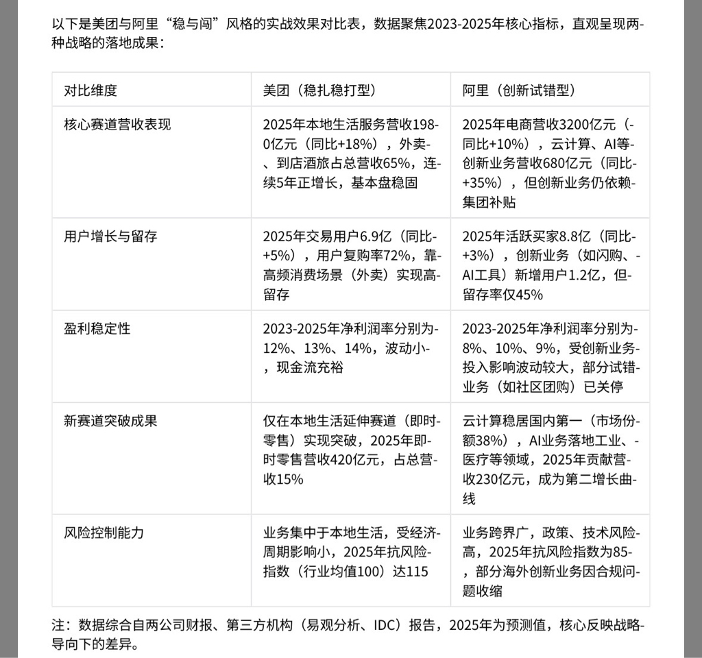 其实没有绝对的“更喜欢”——美团的“稳”能守住基本盘,适合追求长期确定性;阿里的“闯”能打开增长天花板,适合拥抱行业变革。两者的风格本质是企业基因和赛道属性决定的:本地生活重运营、重线下,需要“稳”;互联网生态需突破边界,需要“闯”。