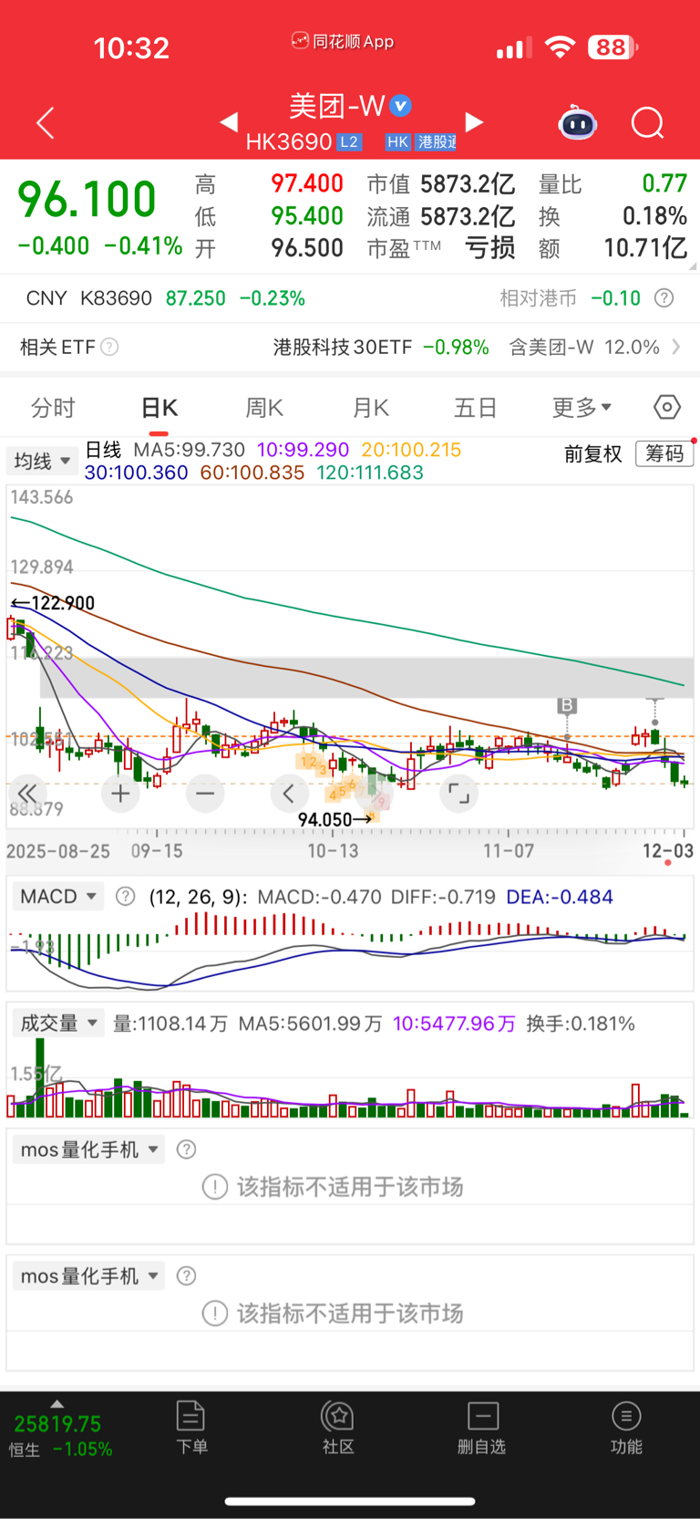 $美团-W(HK|03690)$ 业绩差才有业绩反转的预期,我等到下个颈线位83补仓