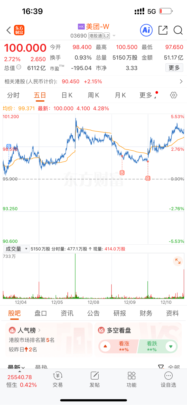 $美团-W(HK|03690)$ 盘感还不错。到100了。个人感觉近期95,96不会有了。97.5到98震荡到104左右。