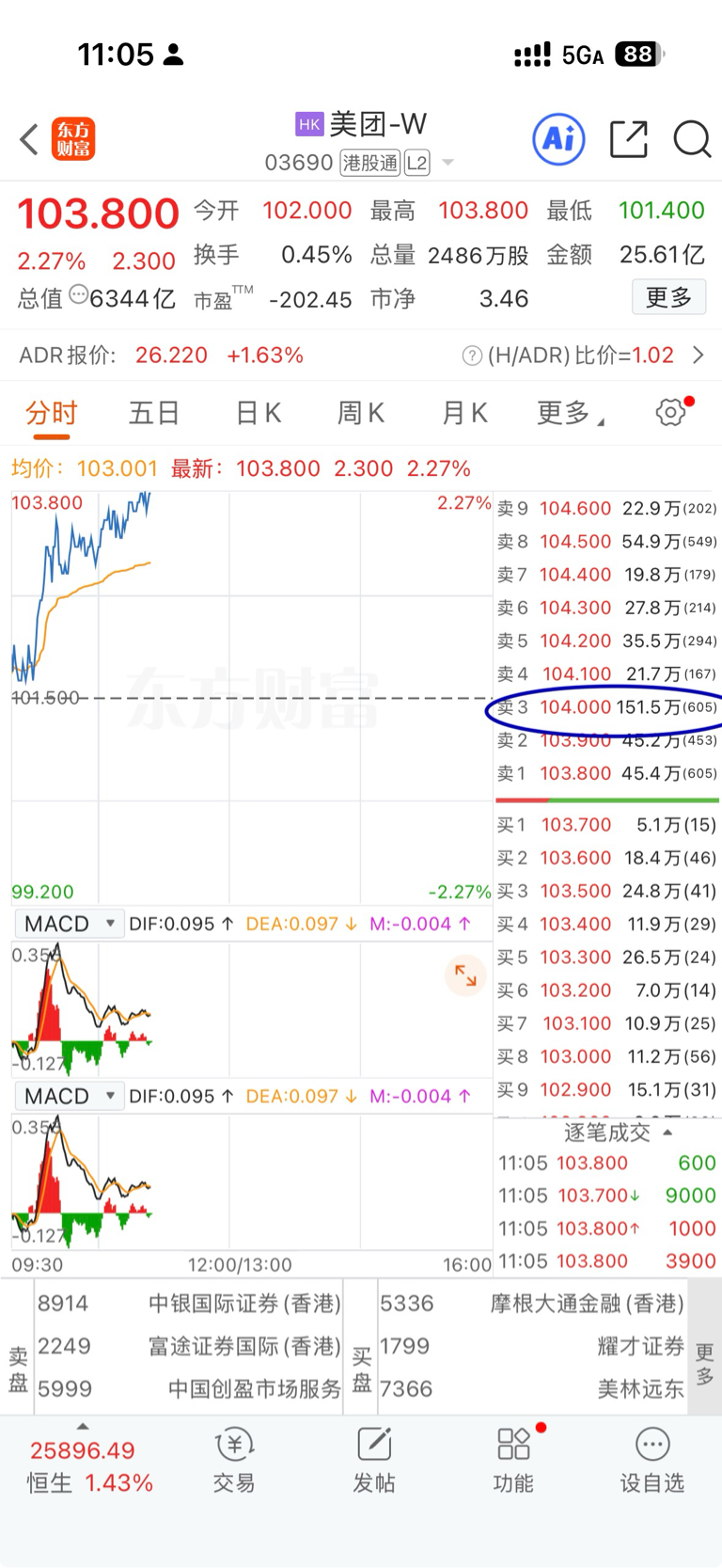 美团卖3的151.5万压单,主要是压制股价、测试承接力,也可能是分批出货或诱空洗
