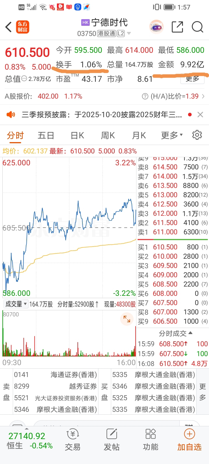 宁德港股才900亿市值,A股1.8万亿市值,盘子相差20倍。