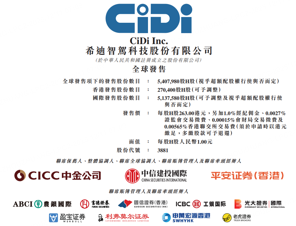 12月11日,希迪智驾(03881)于12月11日-12月16日招股,公司拟全球发售540.8万股H股,其中香港公开发售占约5%,国际发售占约95%,另有15%超额配股权。每股发售价格263港元,每手10股H股,预期H股将于12月19日开始在联交所买卖。