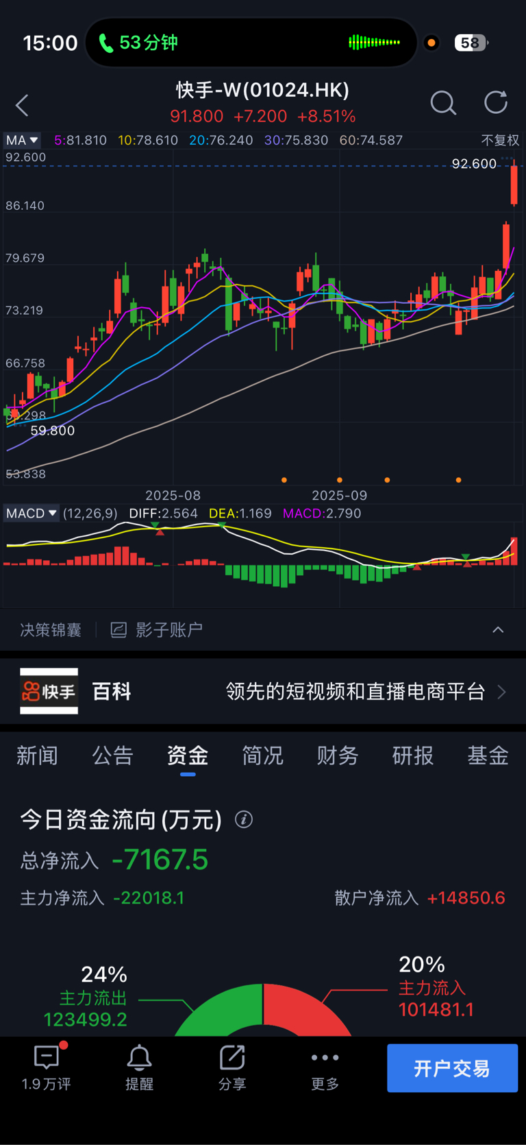 快手涨那么多资金也是流出然后金山今天早上冲了一下稳定在这流出。