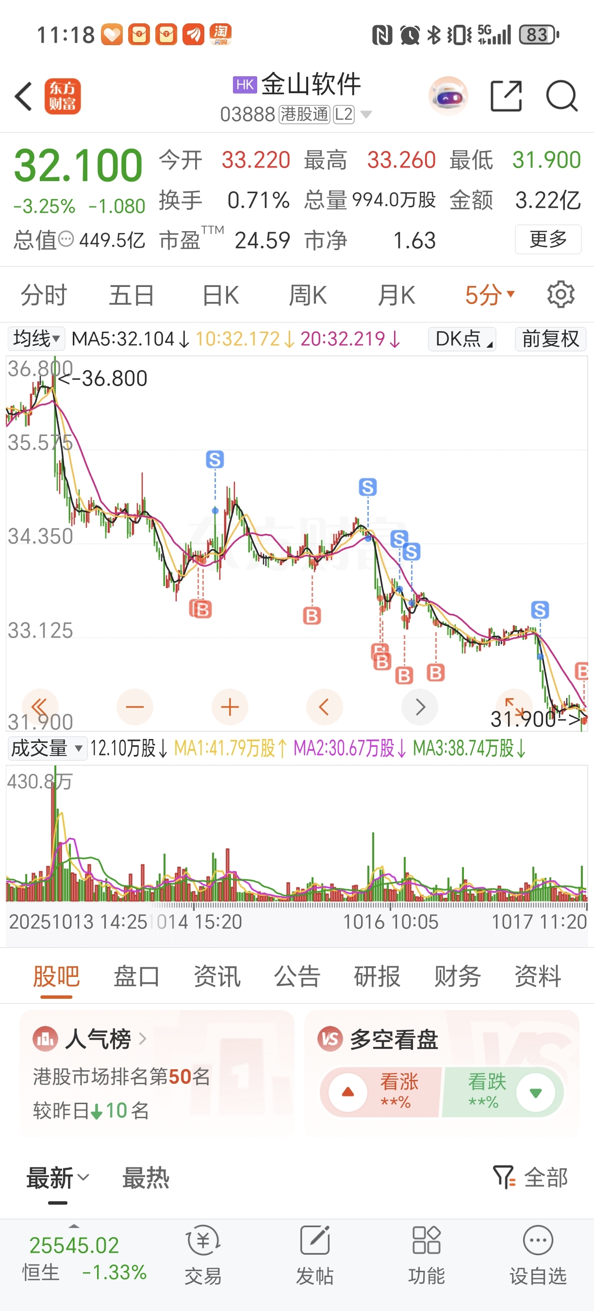 $金山软件(HK|03888)$ 一路做T,跌这么多我居然是盈利的,我都觉得自己操作很nice