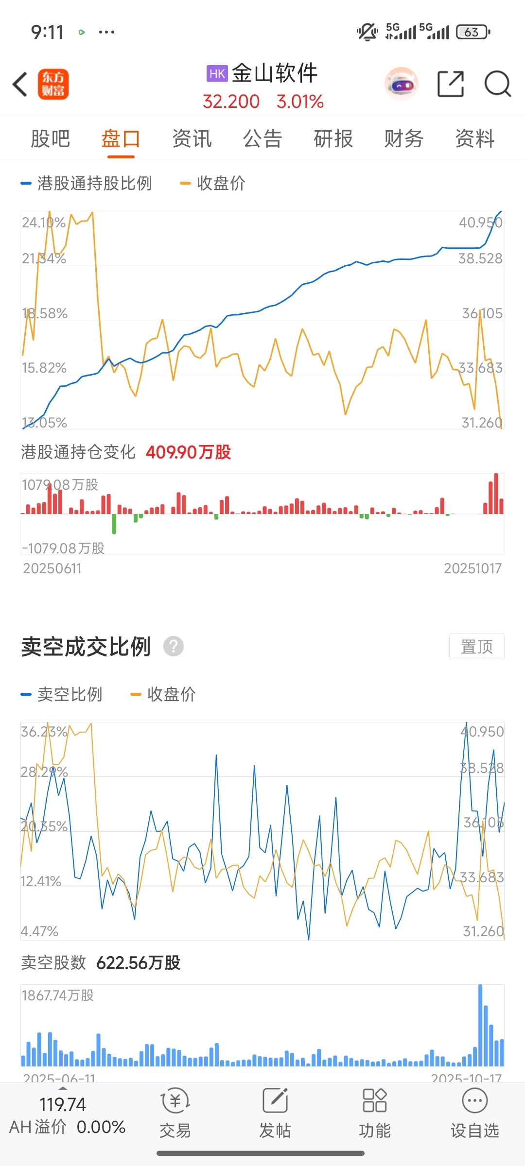 $金山软件(HK|03888)$ 港股通持股比例快速增加,卖空也是居高不下,看最后谁爆。